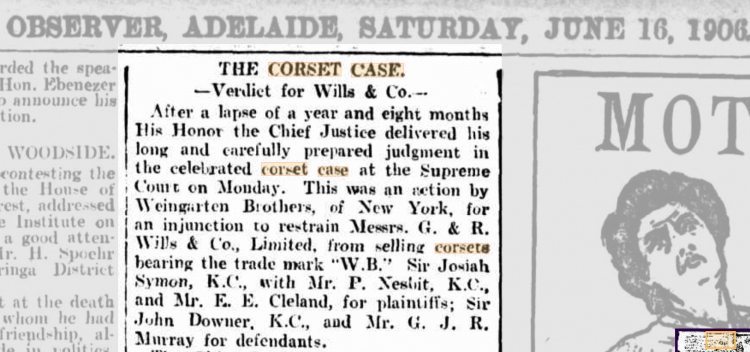 The William Pretty and Sons brand had been on the market in South Australia for at least nine years while Weingarten Brothers had only recently begun importing and selling their corsets.