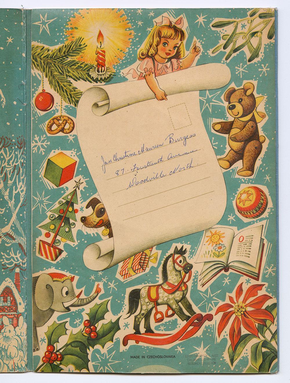 In moments of great timing, this Kubašta Father Christmas pop-up book (1961), was donated just as we were planning this year’s Christmas displays. We were immediately enchanted by the scenes of Christmases past, from the traditional 19th Century carolers to the 1950s-inspired toys, and design elements such as the cellophane windows.
