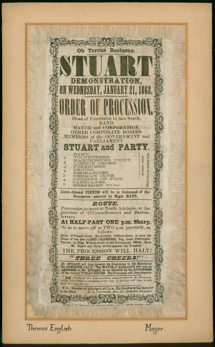 The South Australian Government awarded Stuart 2,000 pounds for his pioneering journey, although he was only permitted to access the interest from the funds. This silk Order of Procession was created to commemorate that historic tribute to Stuart’s remarkable feat.